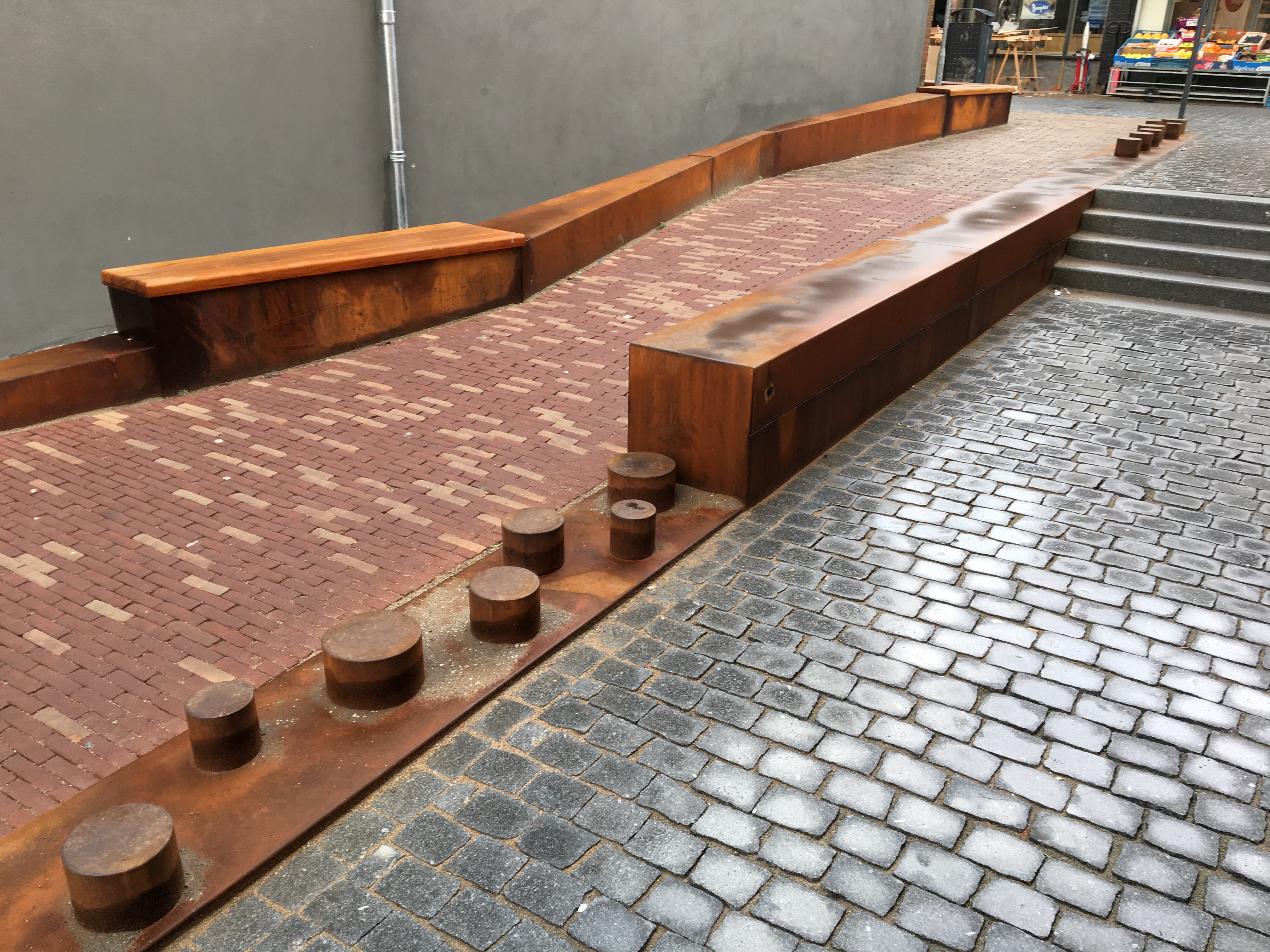 Voor het project Spuisteeg maakte Ars Virens een ontwerp met Cortenstalen Giro Parkbanden met leuke details als houten zittingen en kleine poefs. Daarnaast werd de natuurstenen loopstrook doorgetrokken ten behoeve van een duidelijkere verbinding met het achterliggende gebied.
