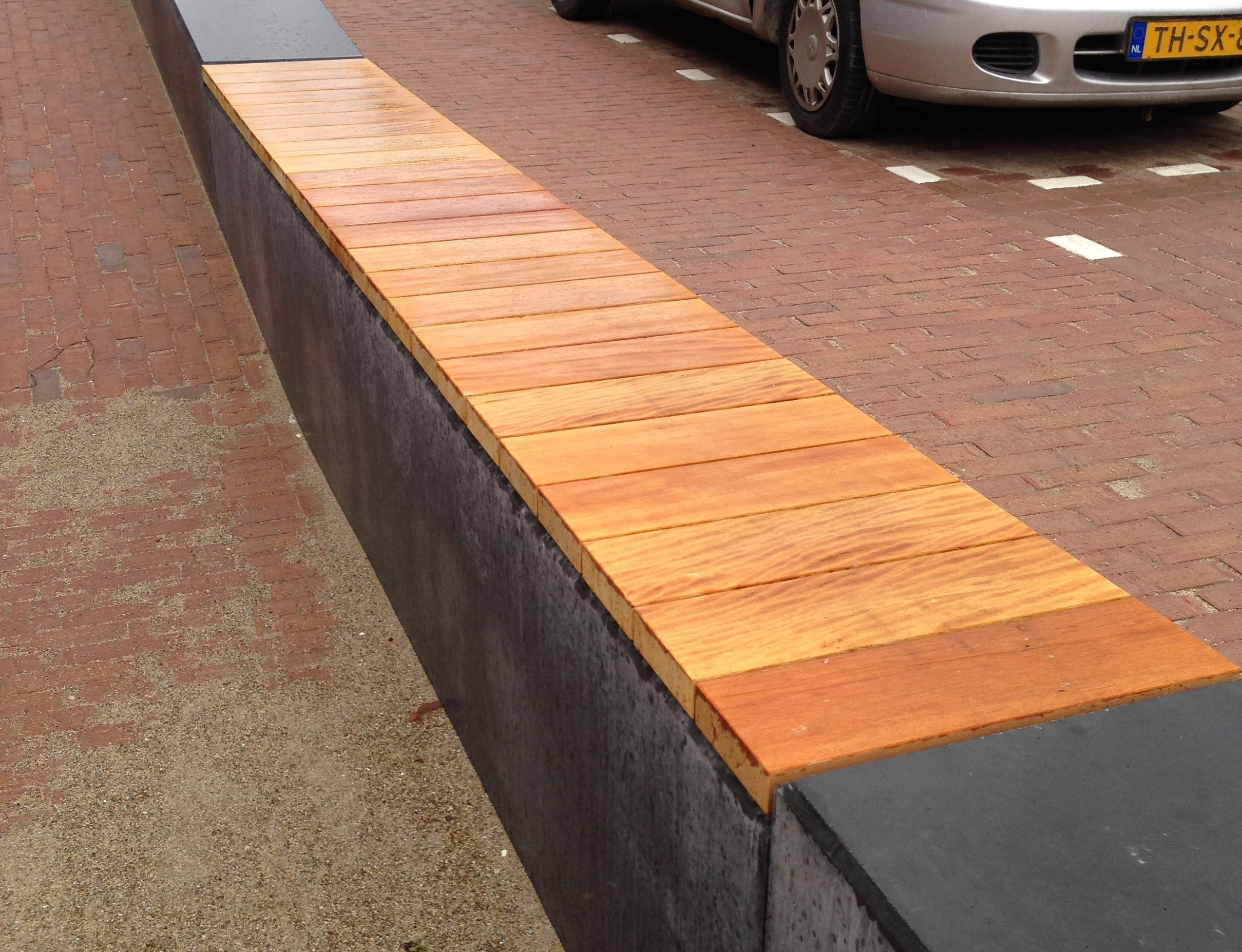 Hierdoor moest er een oplossing worden gevonden voor de hoogteverschillen ter plaatse van de nieuwbouw. Naar een ontwerp van Buro Imoss werd het geheel tot uitvoering gebracht. De antracietkleurige betonnen Giro Parkbanden 50x100 cm (bxh) en traptreden