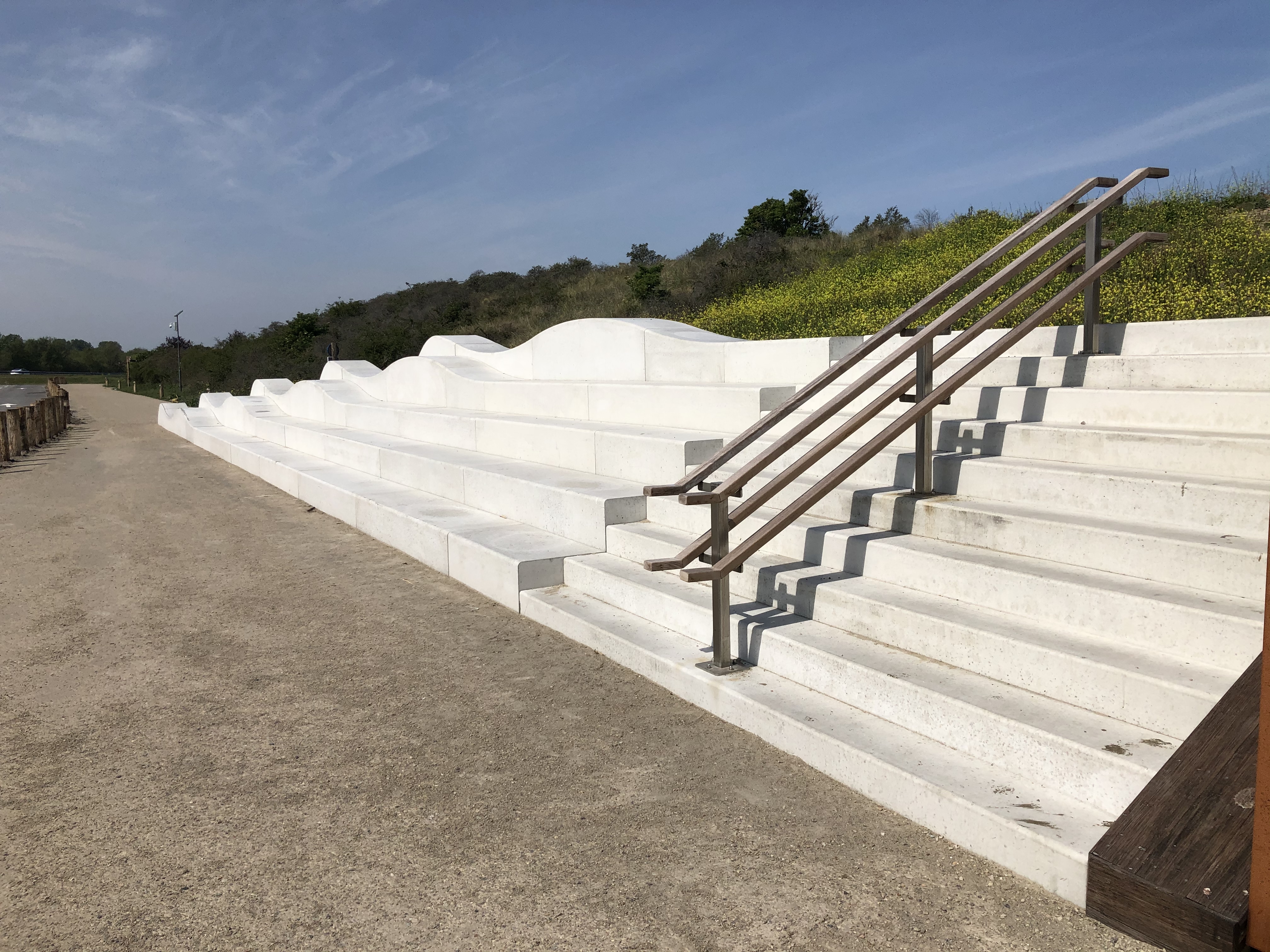 Als verwijzing naar de golven van de zee is ervoor gekozen om de bovenste elementen van de trappartij ook golvend uit te voeren.