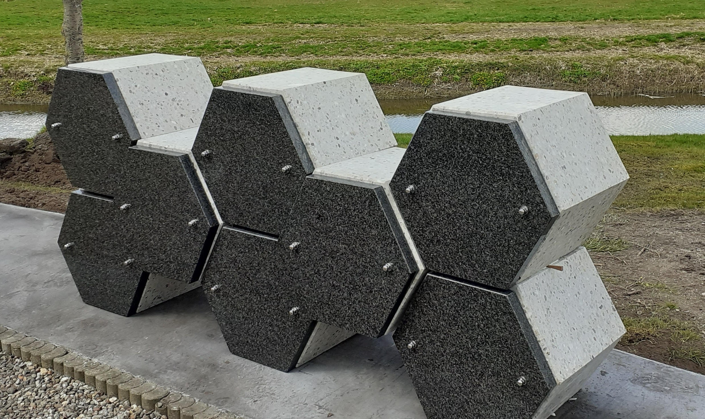 Hierbij is de keuze gevallen op 8 st. Columbariumelementen Zeskant GICO ZS5244 met sponning in een wit gepolijste uitvoering en voorzien van Jasberg granieten gepolijste afsluitplaten.