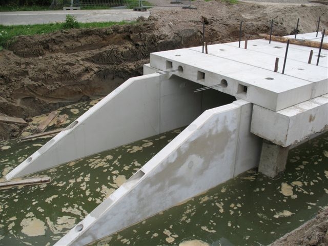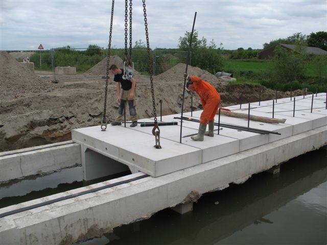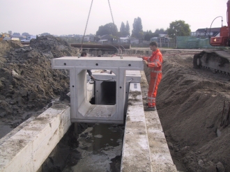 Na het voltooien van de langskespen worden de duikerelementen ingehangen, nadat de grond tussen de kespen en de palen (voorzover nodig) is verwijderd.