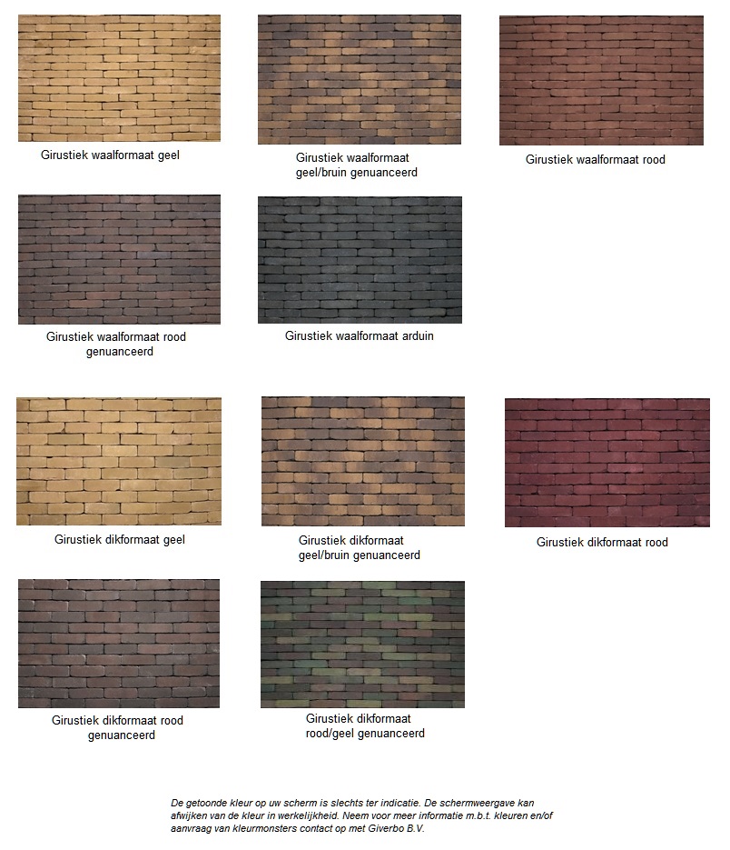 Zoals bekend blijven gebakken straatstenen naar de toekomst toe hun kleur en daarmee hun waarde houden. Het meest gewild zijn hierbij zelfs de gebruikte gebakken waal- en dikformaten. Met de Girustiek gebakken steen is er een steen op de markt gekomen waarmee u een straat of plein kunt voorzien van een nieuw plaveisel zonder dat dit ten koste gaat van het nostalgische karakter.