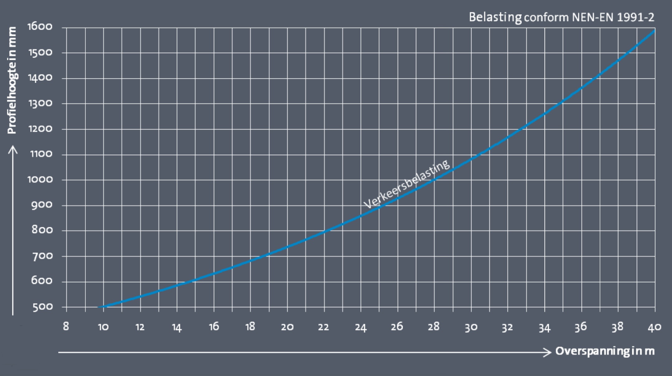 Uitgangspunten grafiek: brughoek 90å, druklaagdikte 230 mm, brugbreedte 14.00 m, statisch bepaald.